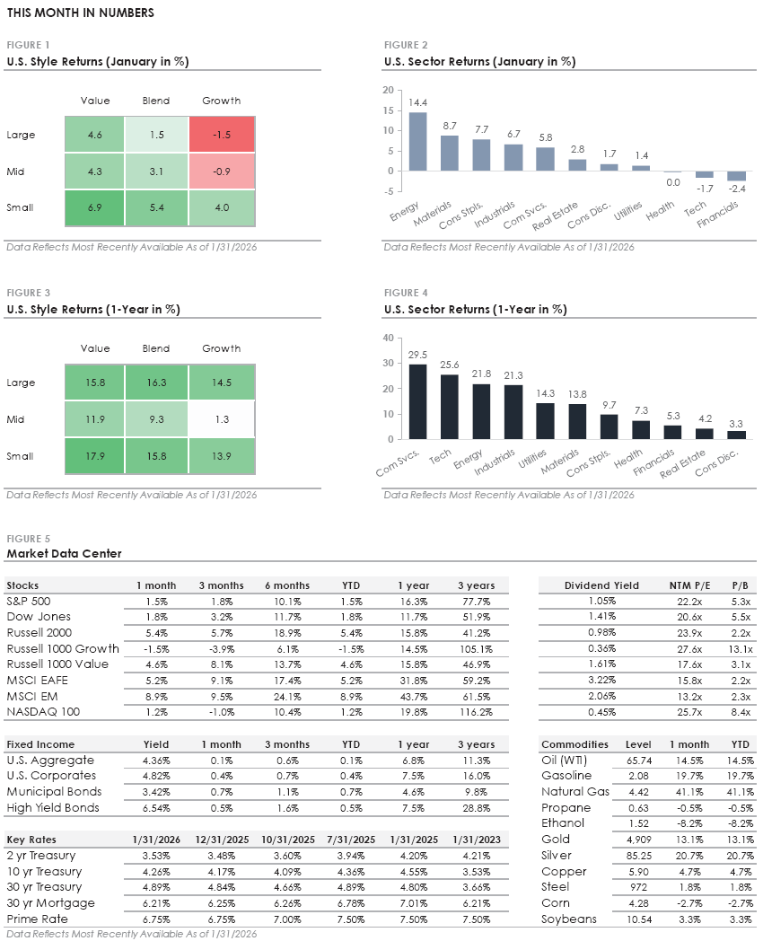 The second theme was a sharp rally in the commodity market. Despite late month volatility, gold rose +10% to a new high, silver surged over +20% to a new high, and oil prices rose to the highest level since last September. Investors turned to commodities as a hedge against global uncertainty, driven by geopolitical tensions, policy uncertainty, and a weaker U.S. dollar. The strength in commodity markets made Energy and Materials the top two performing sectors. This year’s start, with the stock market rotation and commodity rally, highlights how portfolio diversification can help smooth results when leadership shifts.