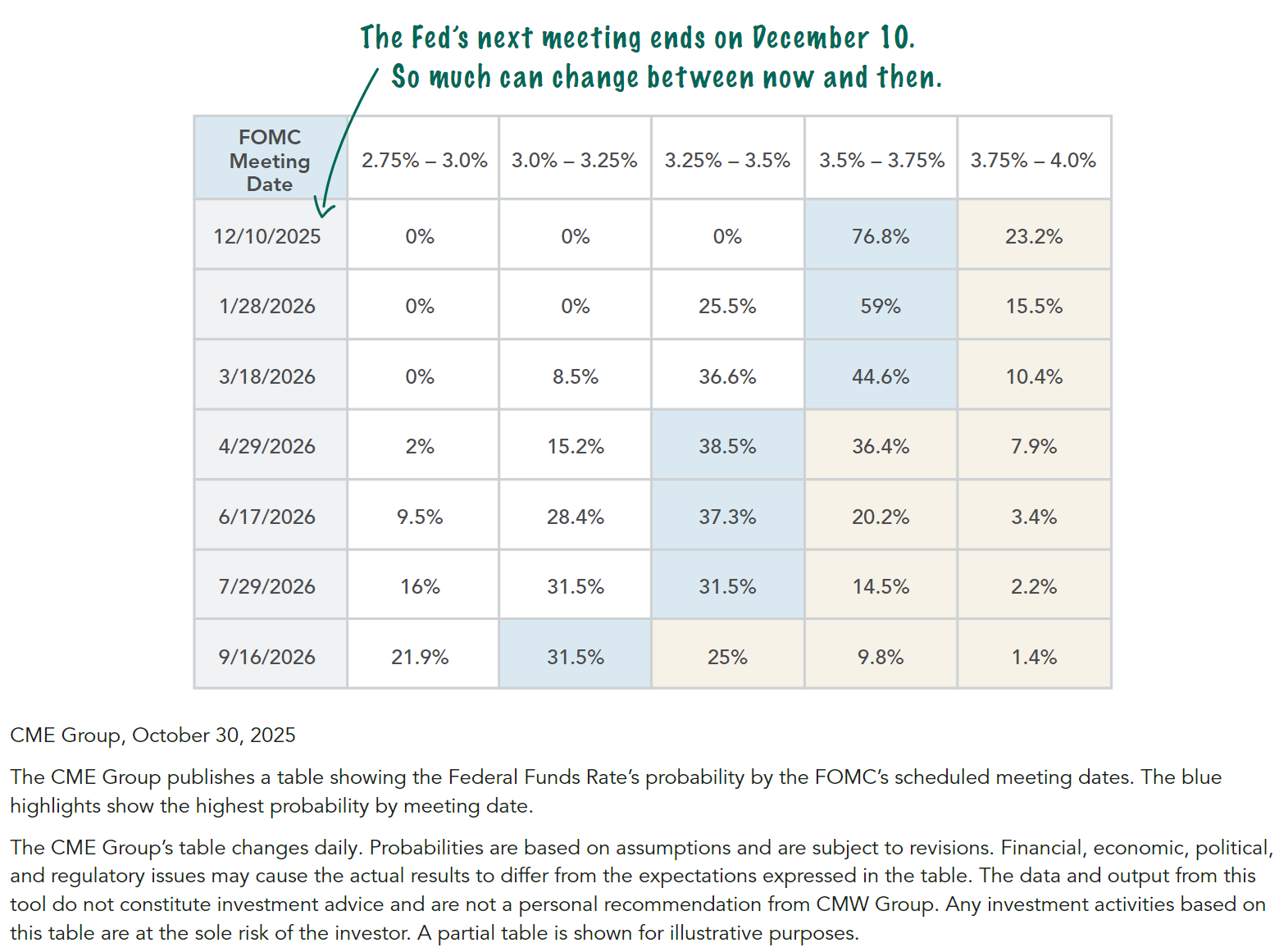 Following the Fed’s October meeting, Fed Chair Powell said he wasn’t certain about whether the Fed would adjust rates again in 2025, which jolted the financial markets. Speculators had assumed there was one more rate change “penciled in” for 2025, so the news caught some by surprise.